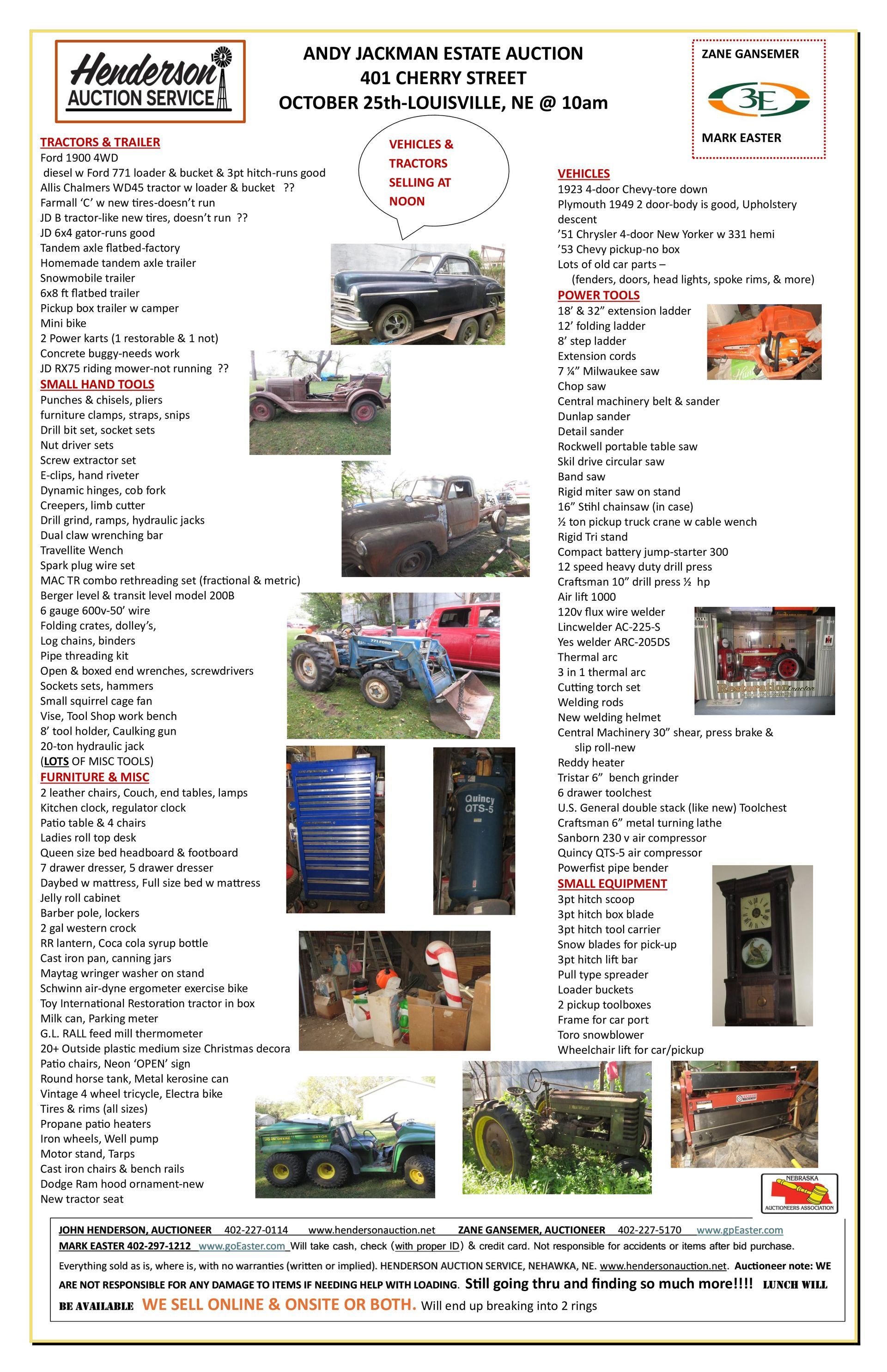 Large auction including vintage cars, running and non running tractors, a UTV, trailers, tools, collectibles and much more. FInding more items everyday, a lot of UNIQUE stuff! Comee see for yourself!